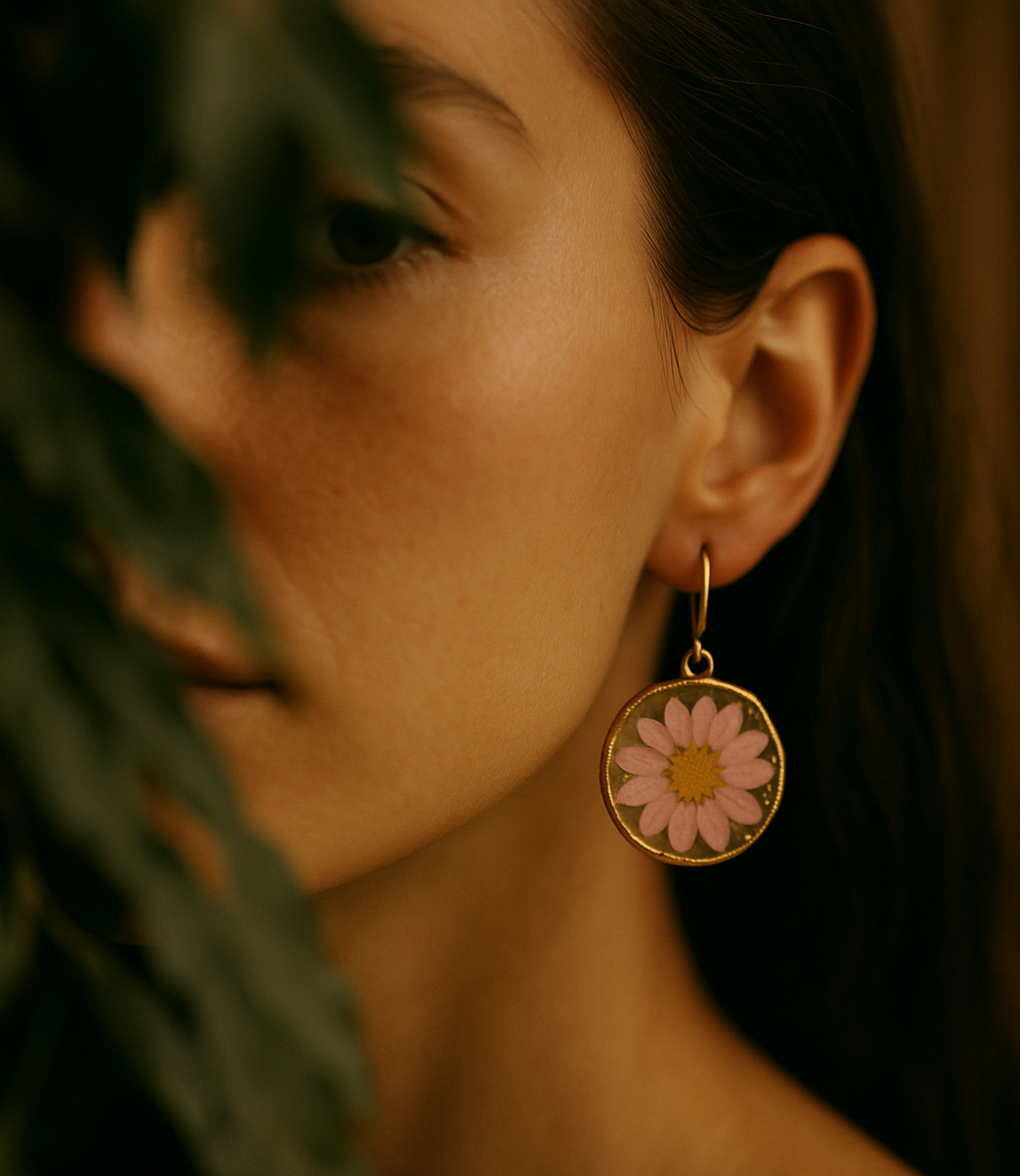 Each piece holds a real flower, connected with nature.