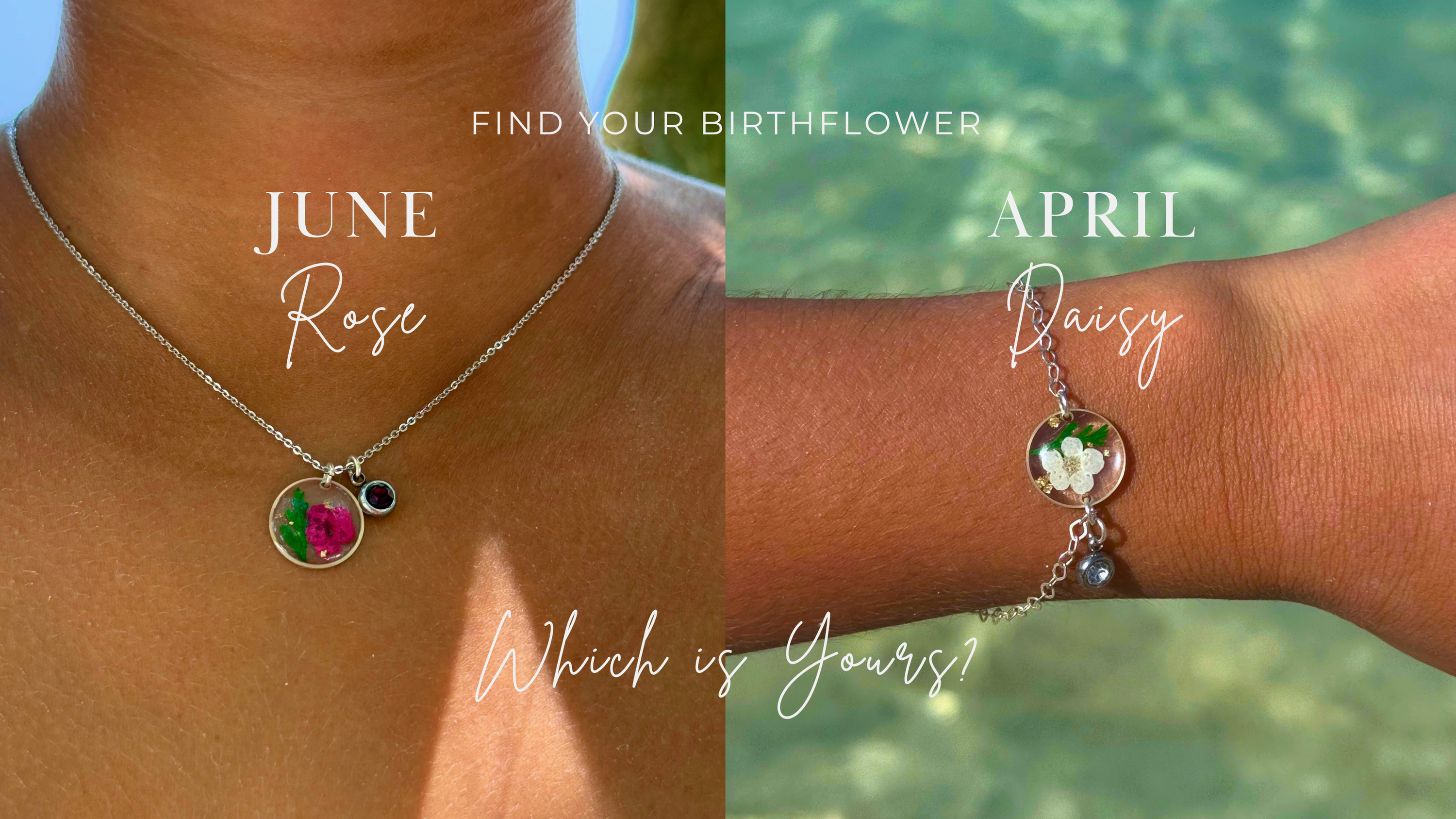 Real birthflowers, handmade in personalised designs. 18k gold plated and 100% 925 silver pieces, gifts with meaning.