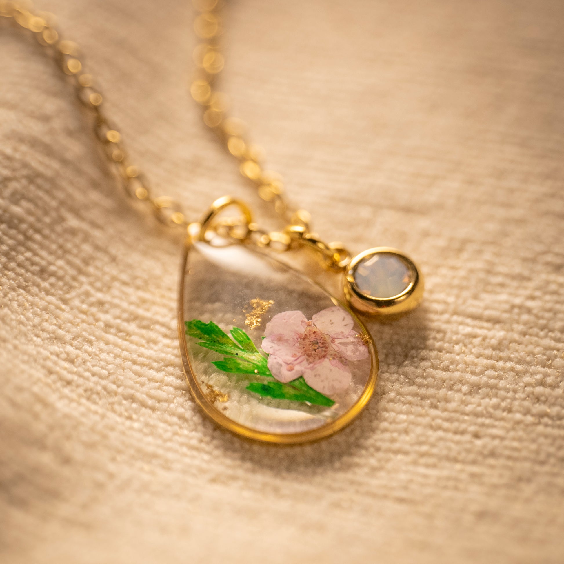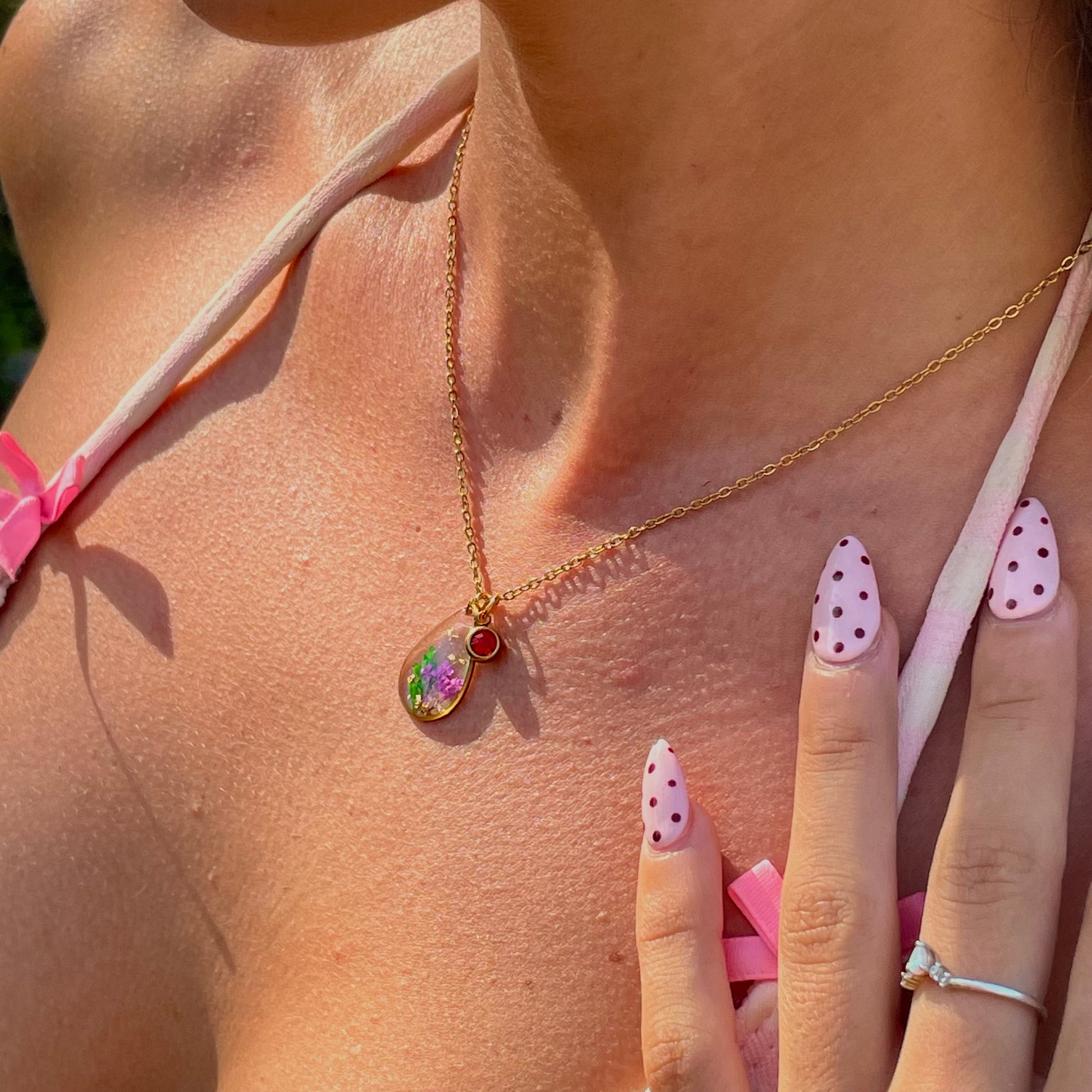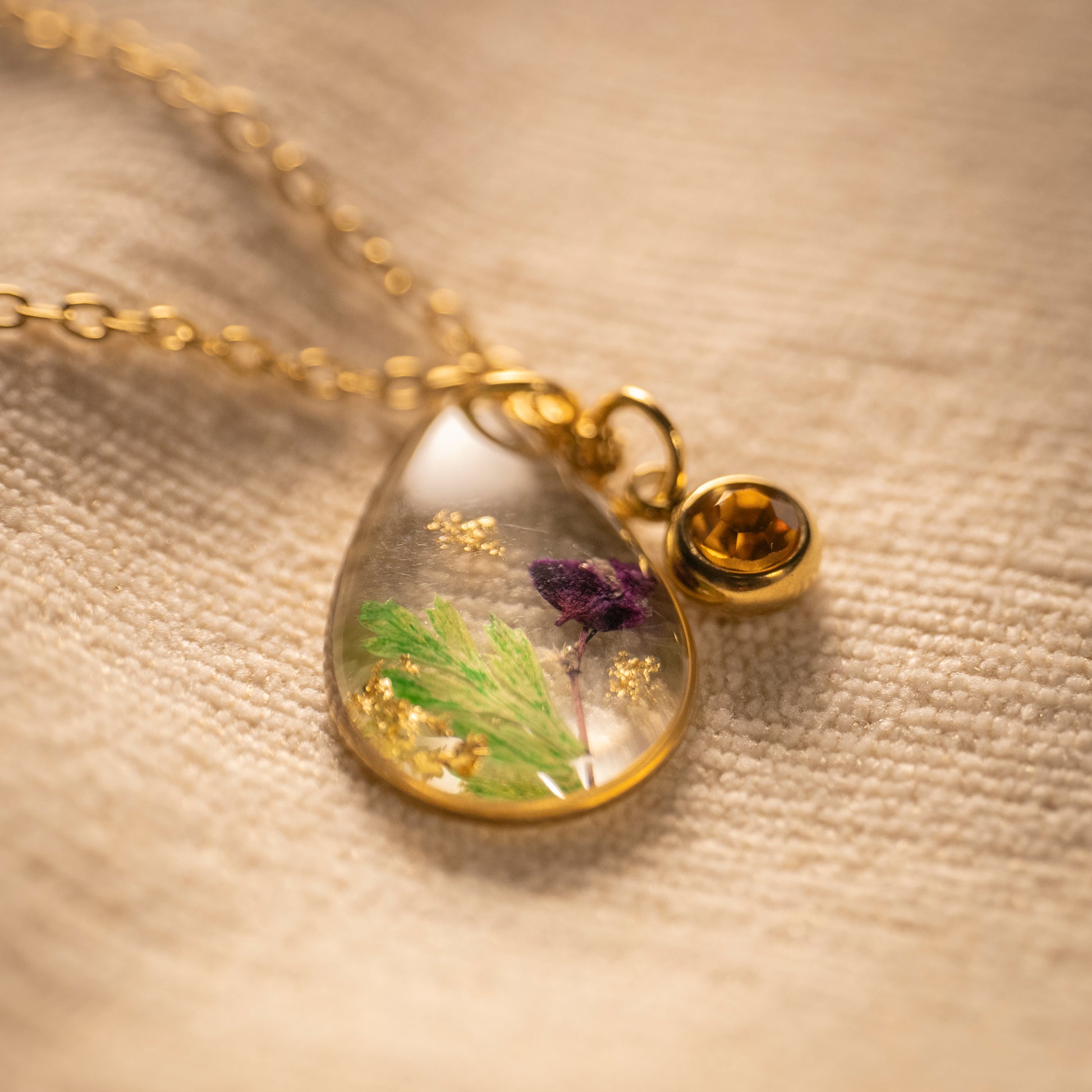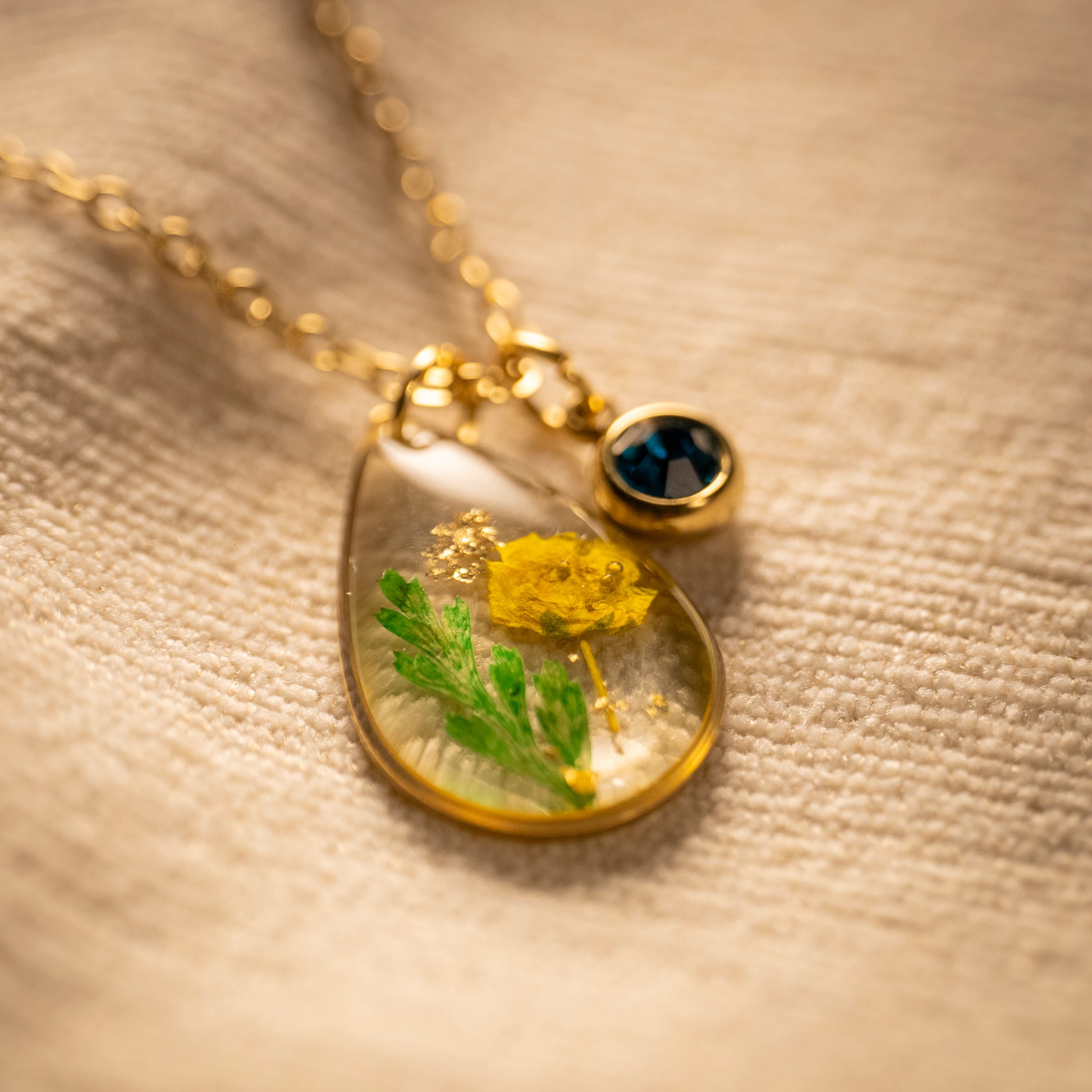 Real flowers preserved in resin and set in 18k gold plated stainless steel. Each necklace represents a birth month flower, making it a personal and meaningful piece to wear close to your heart. Elegant and timeless, it is perfect as a keepsake for yourself or a thoughtful gift for someone special.