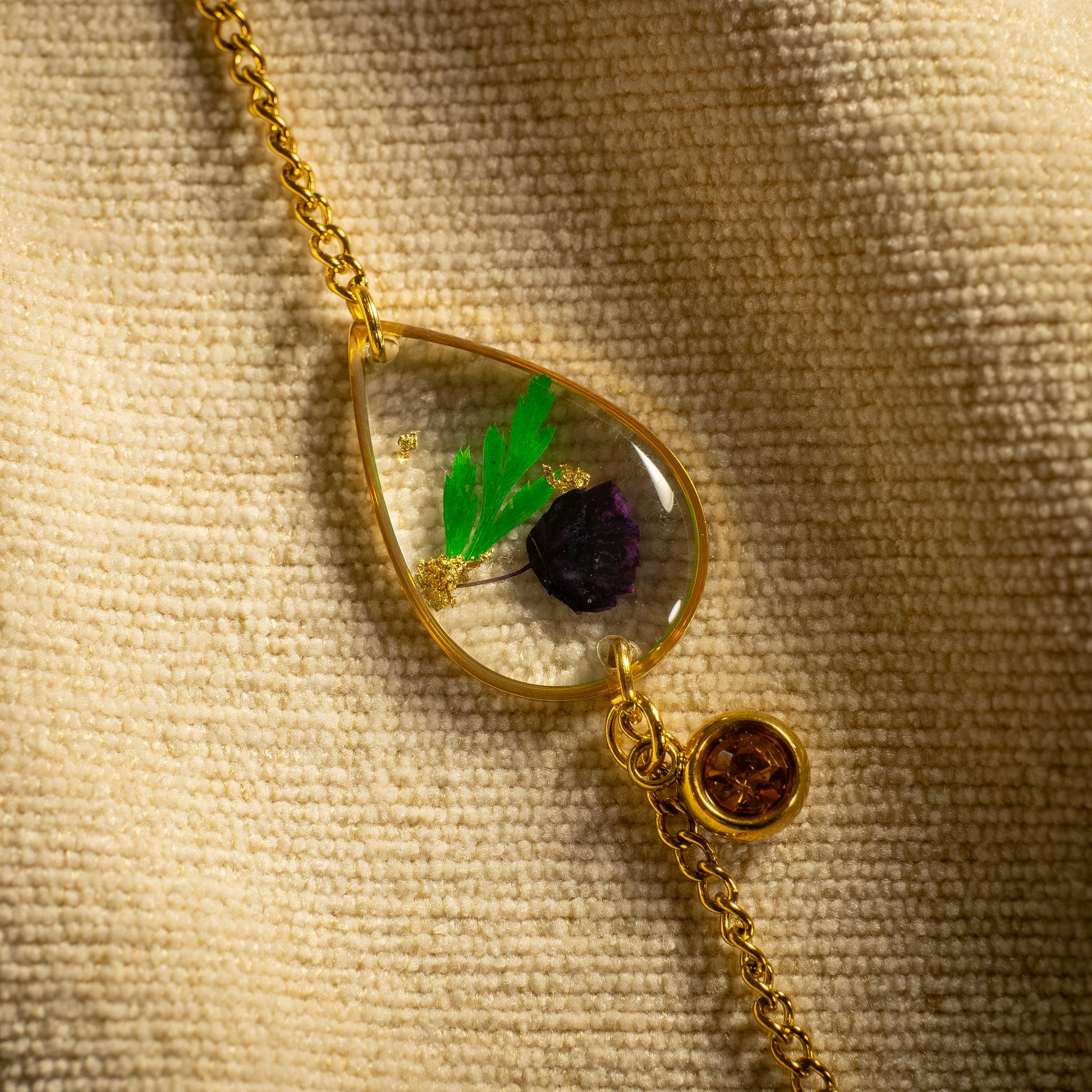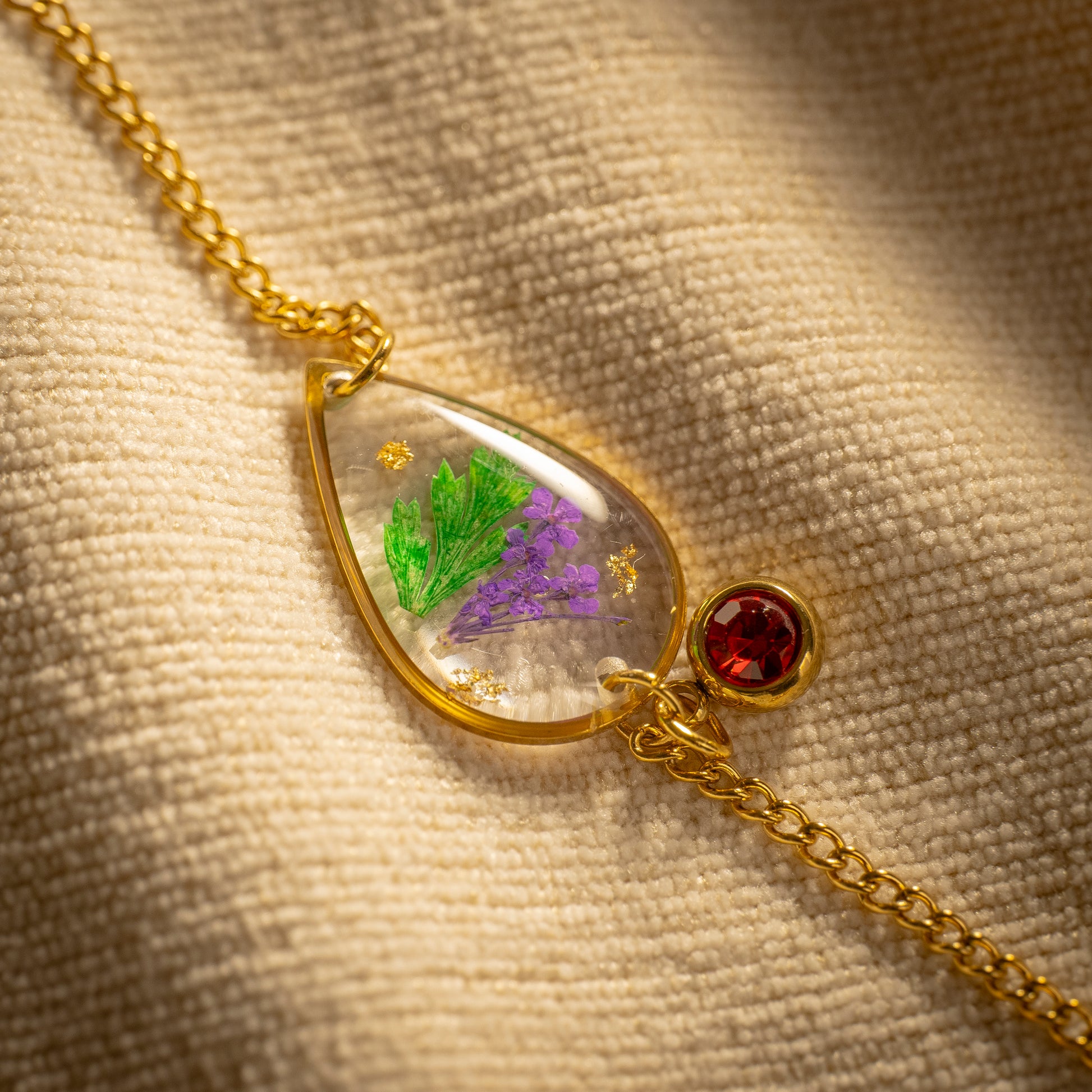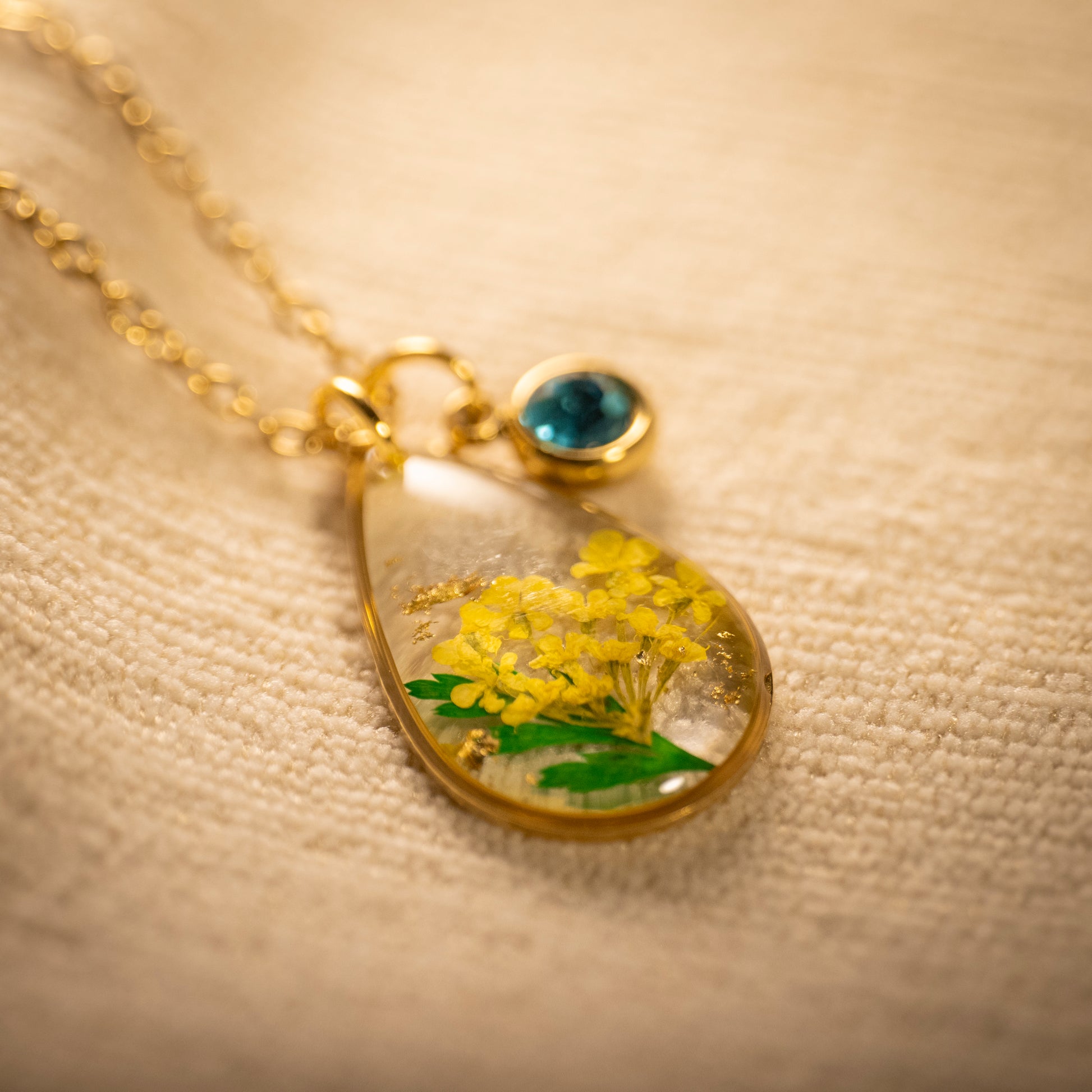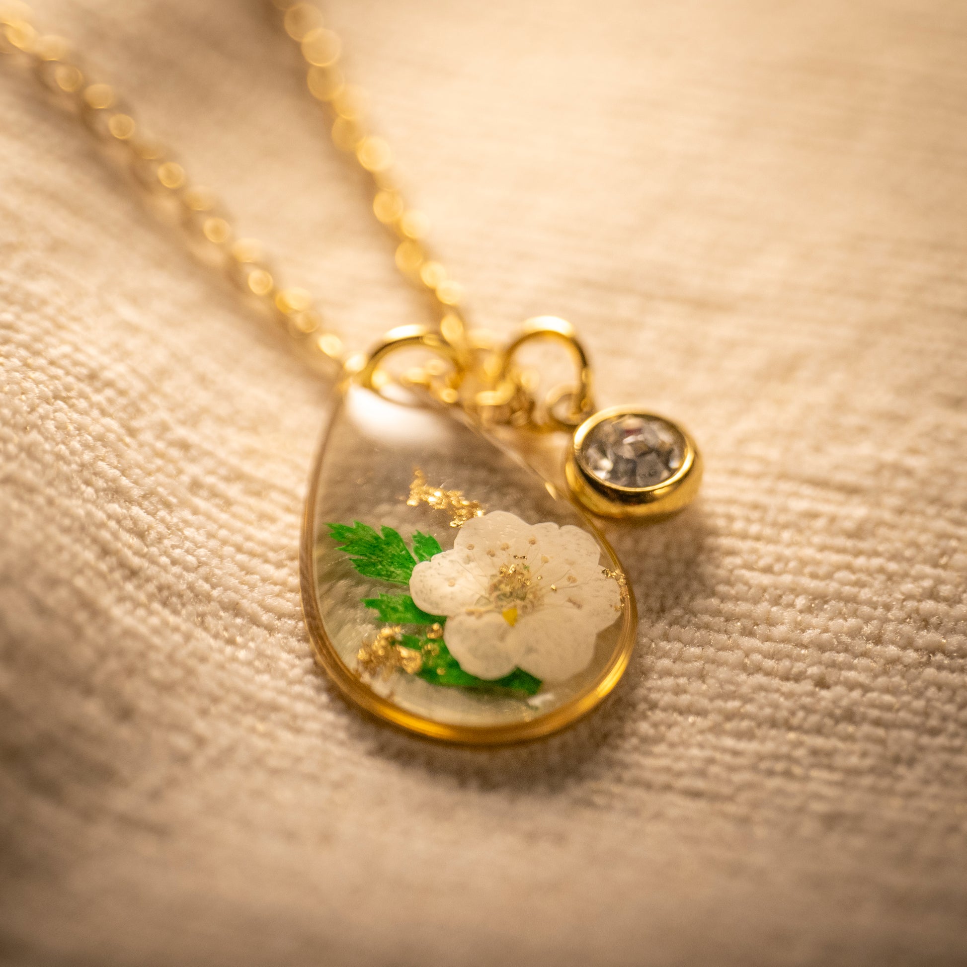 Real flowers preserved in resin and set in 18k gold plated stainless steel. Each necklace represents a birth month flower, making it a personal and meaningful piece to wear close to your heart. Elegant and timeless, it is perfect as a keepsake for yourself or a thoughtful gift for someone special.