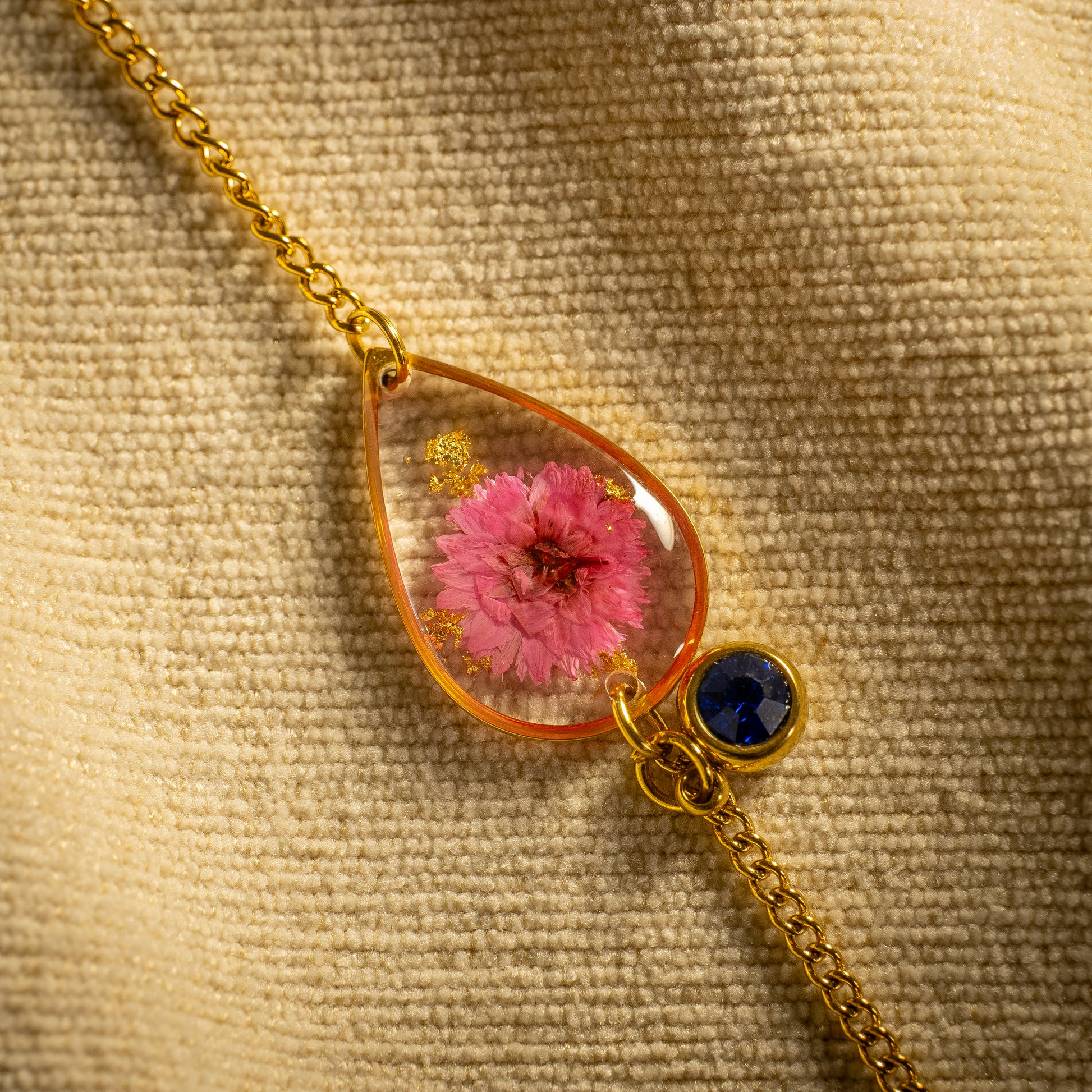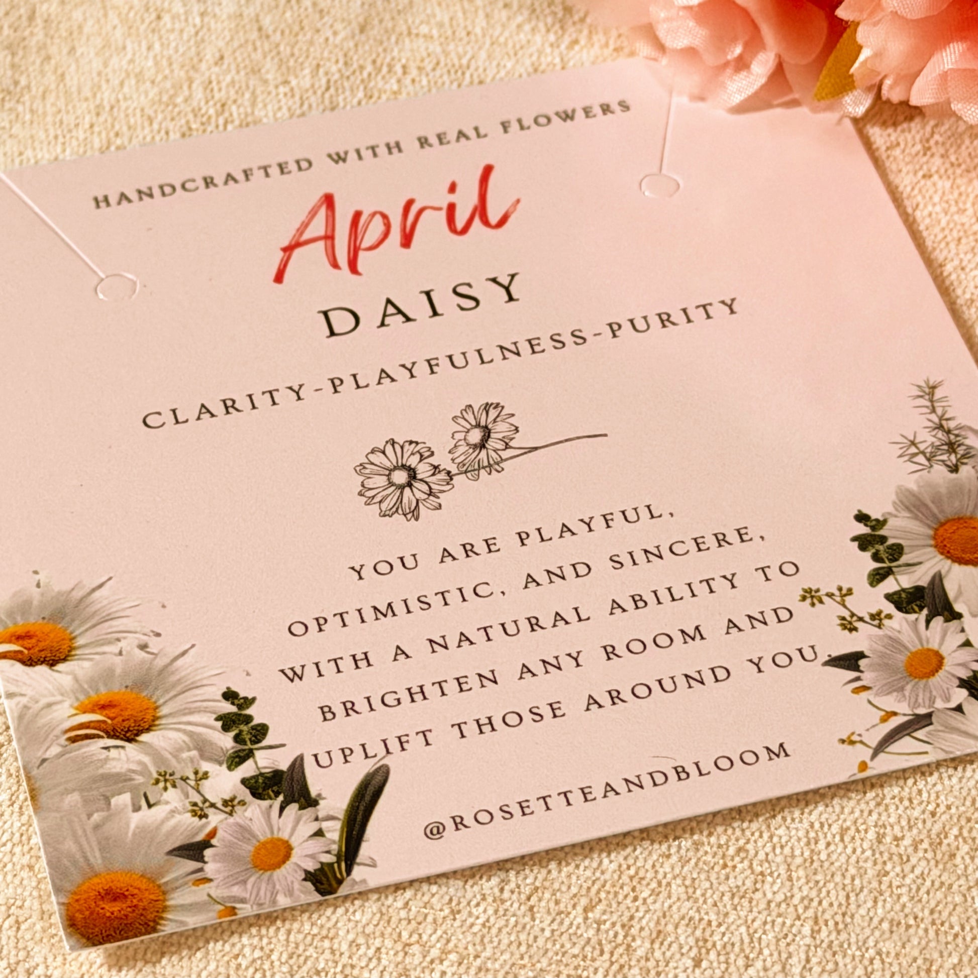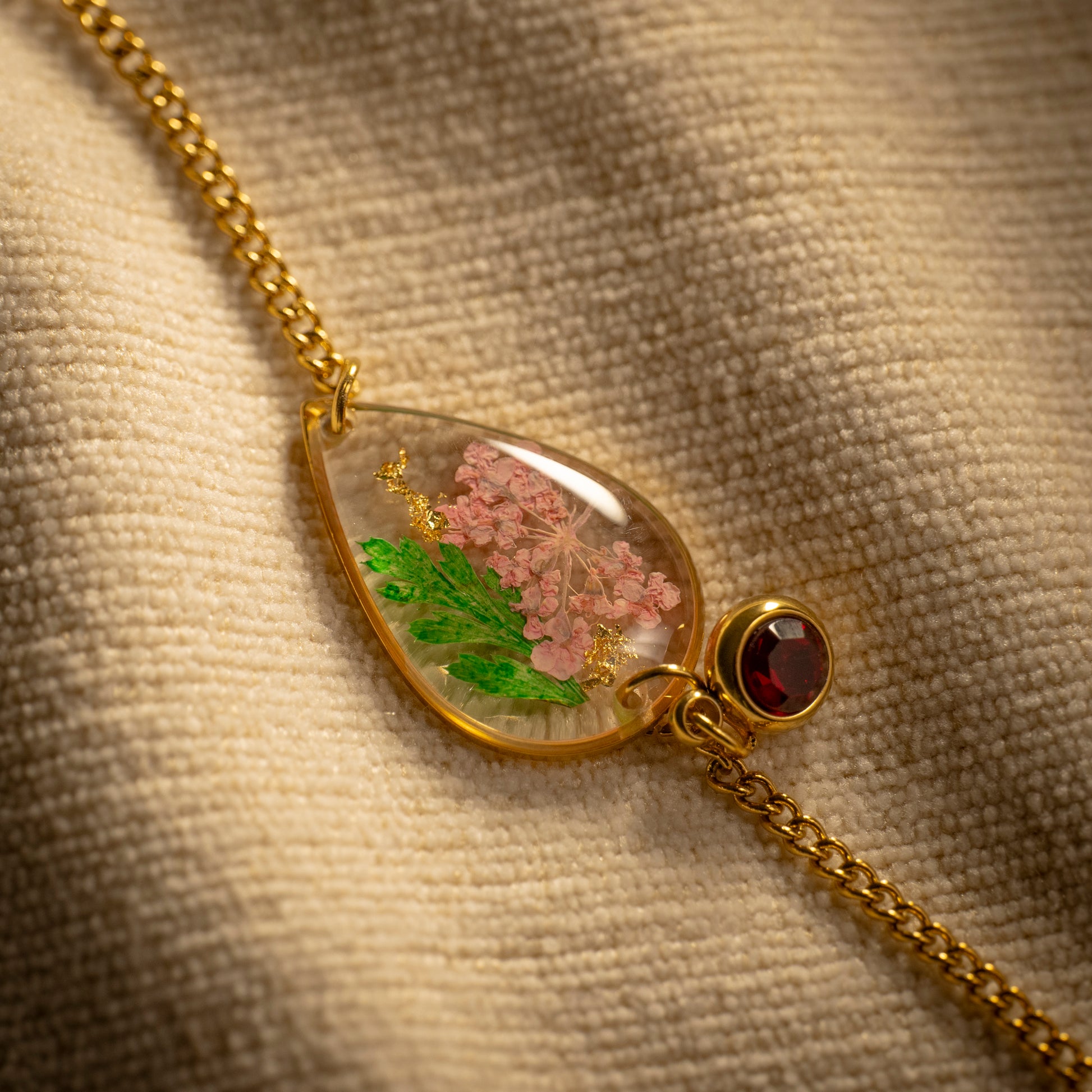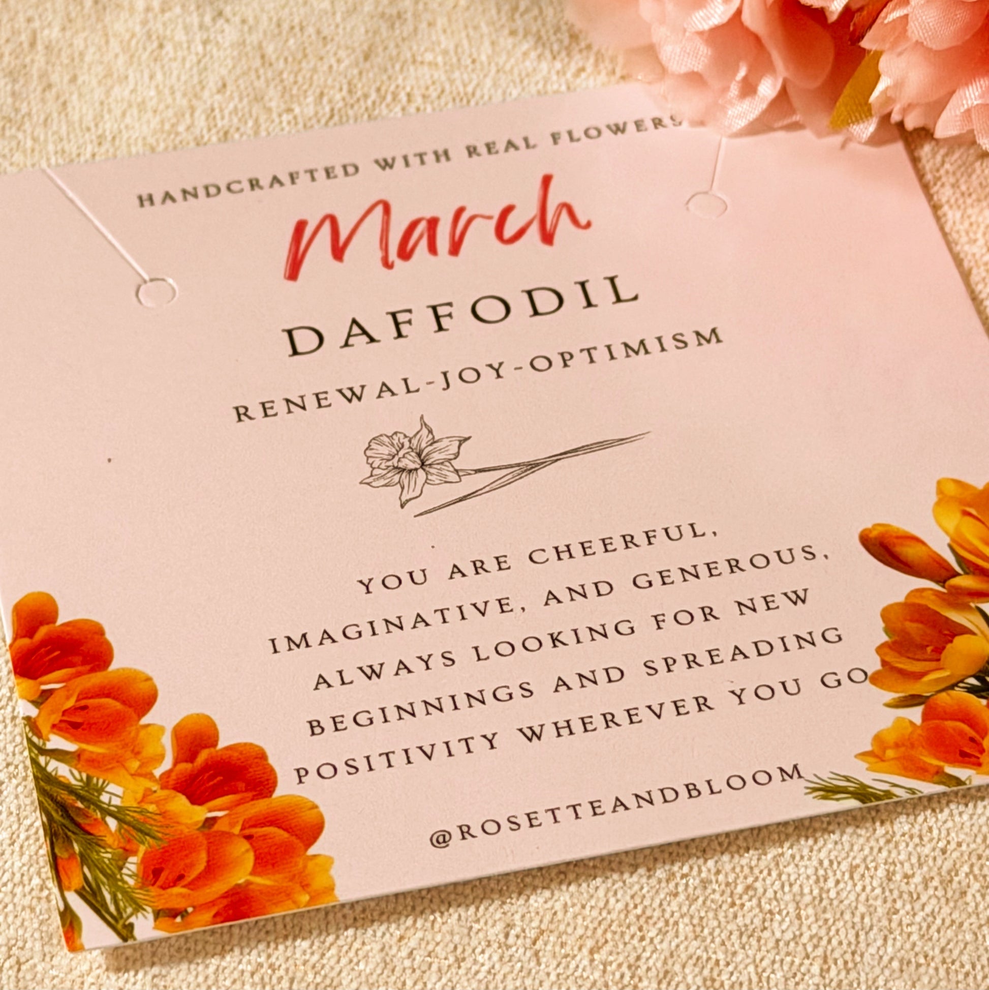 Real flowers preserved in resin and set in 18k gold plated stainless steel. Each necklace represents a birth month flower, making it a personal and meaningful piece to wear close to your heart. Elegant and timeless, it is perfect as a keepsake for yourself or a thoughtful gift for someone special.
