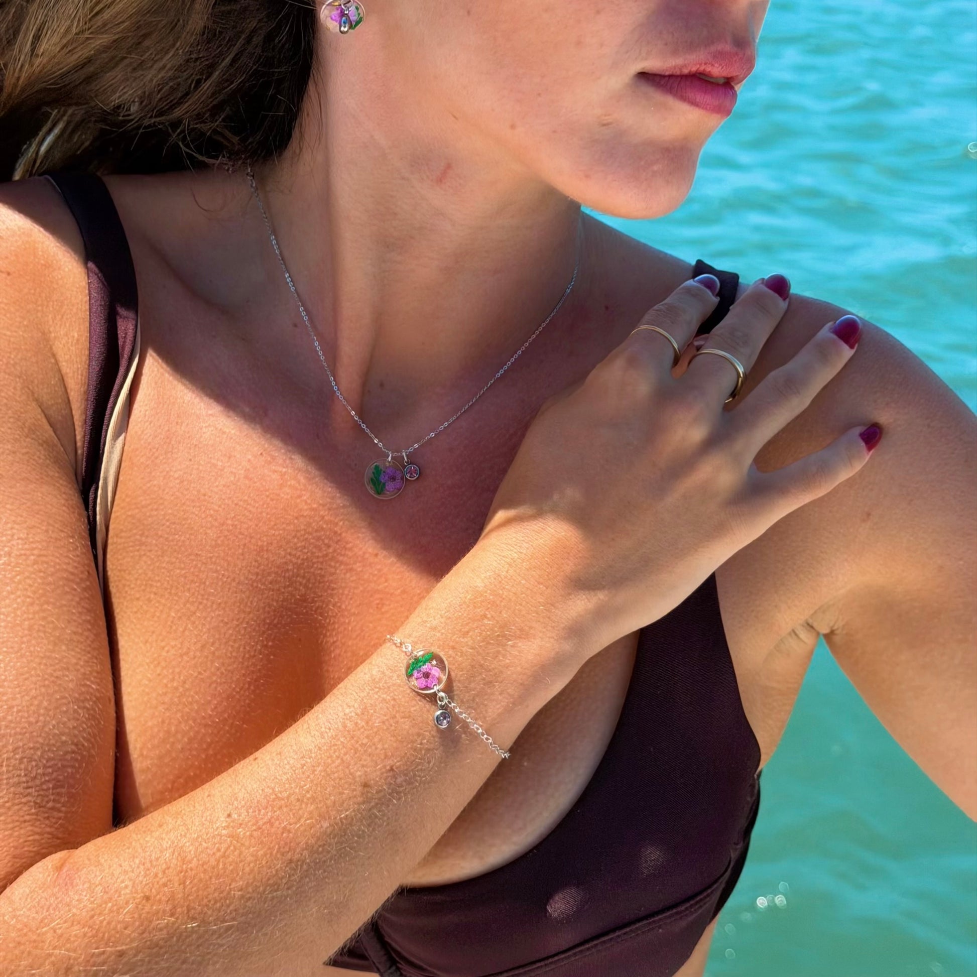 Each piece features a genuine flower grown from the earth, handpicked at full bloom, and preserved forever in resin.